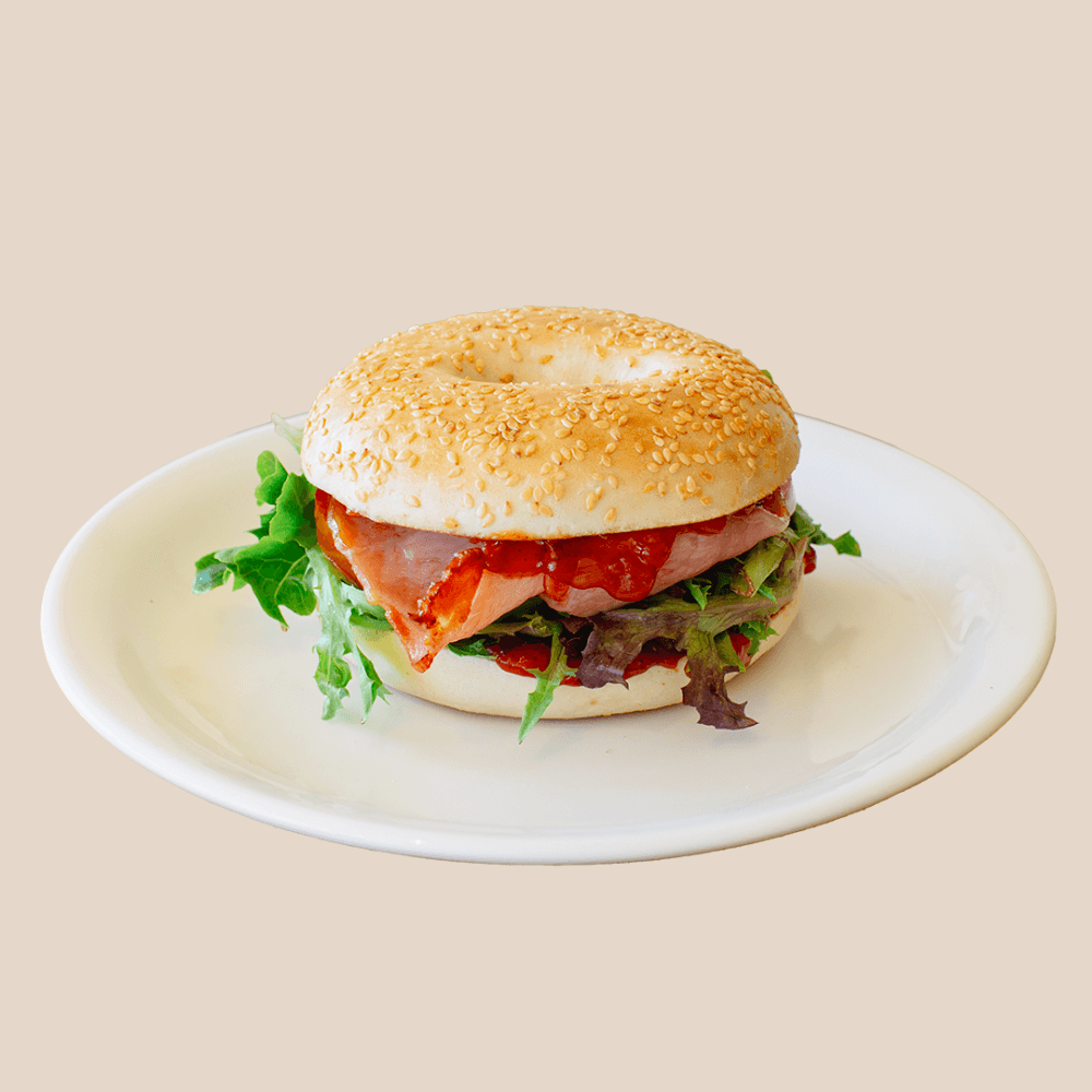Crispy bacon, fresh lettuce, and ripe tomato, layered with rich tomato relish on a toasted bagel. A classic favourite with a flavourful twist!