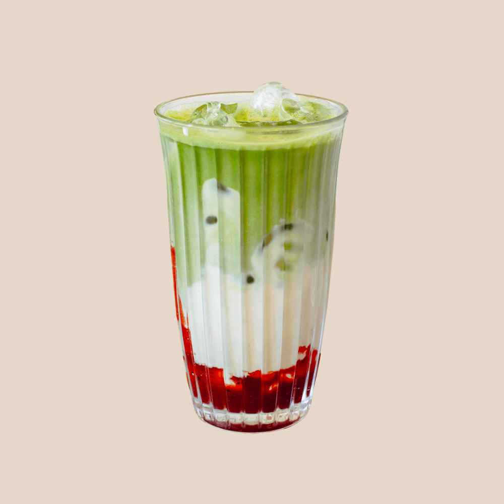 A refreshing iced strawberry matcha made with vibrant green tea, house-made strawberry purée, and creamy milk over ice—sweet, fragrant, and perfectly balanced.