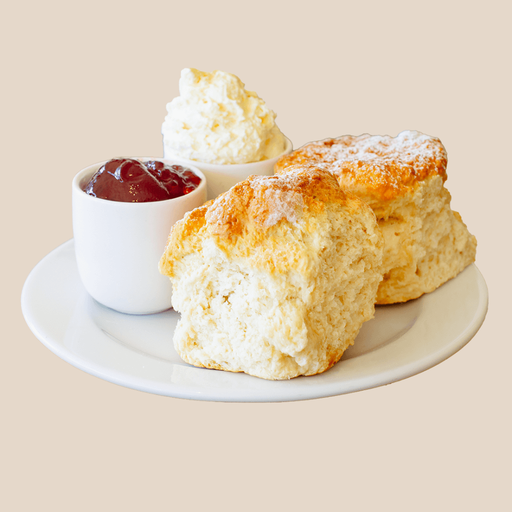 Freshly baked, light, and fluffy, served with jam and cream. A classic treat, made in-house for the perfect bite!